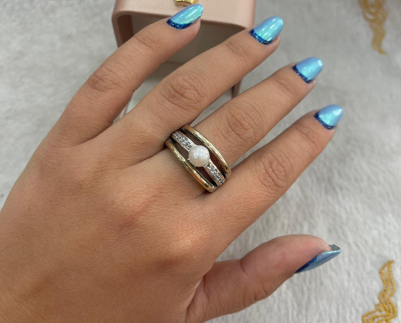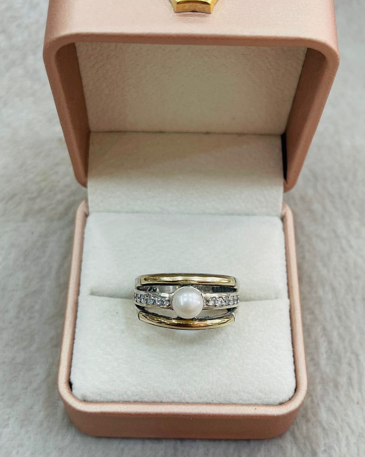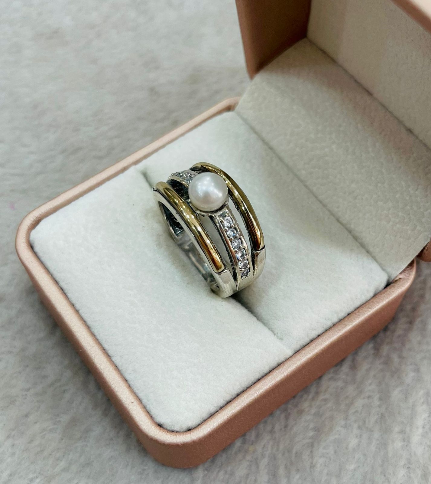 Anillo de Plata Circón y Piedra de Aguadulce Central con Lámina Dorada