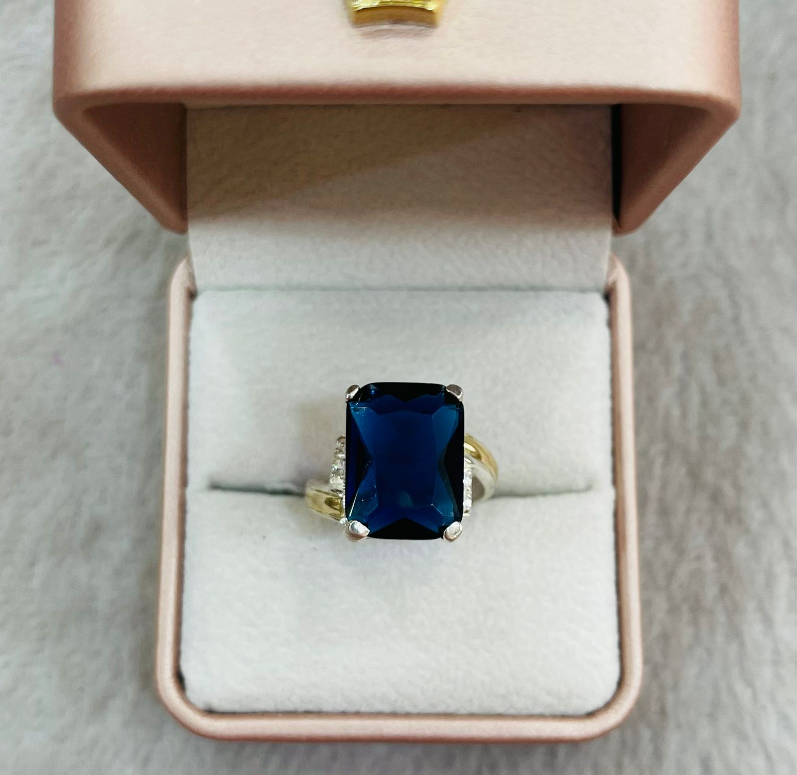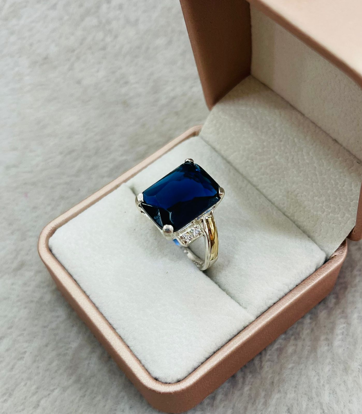 Este anillo de alta calidad está compuesto por una base de plata noble adornada con una piedra circón azul de intensidad vibrante, rodeada por detalles de lámina dorada que le otorgan un toque de sofisticación y elegancia.