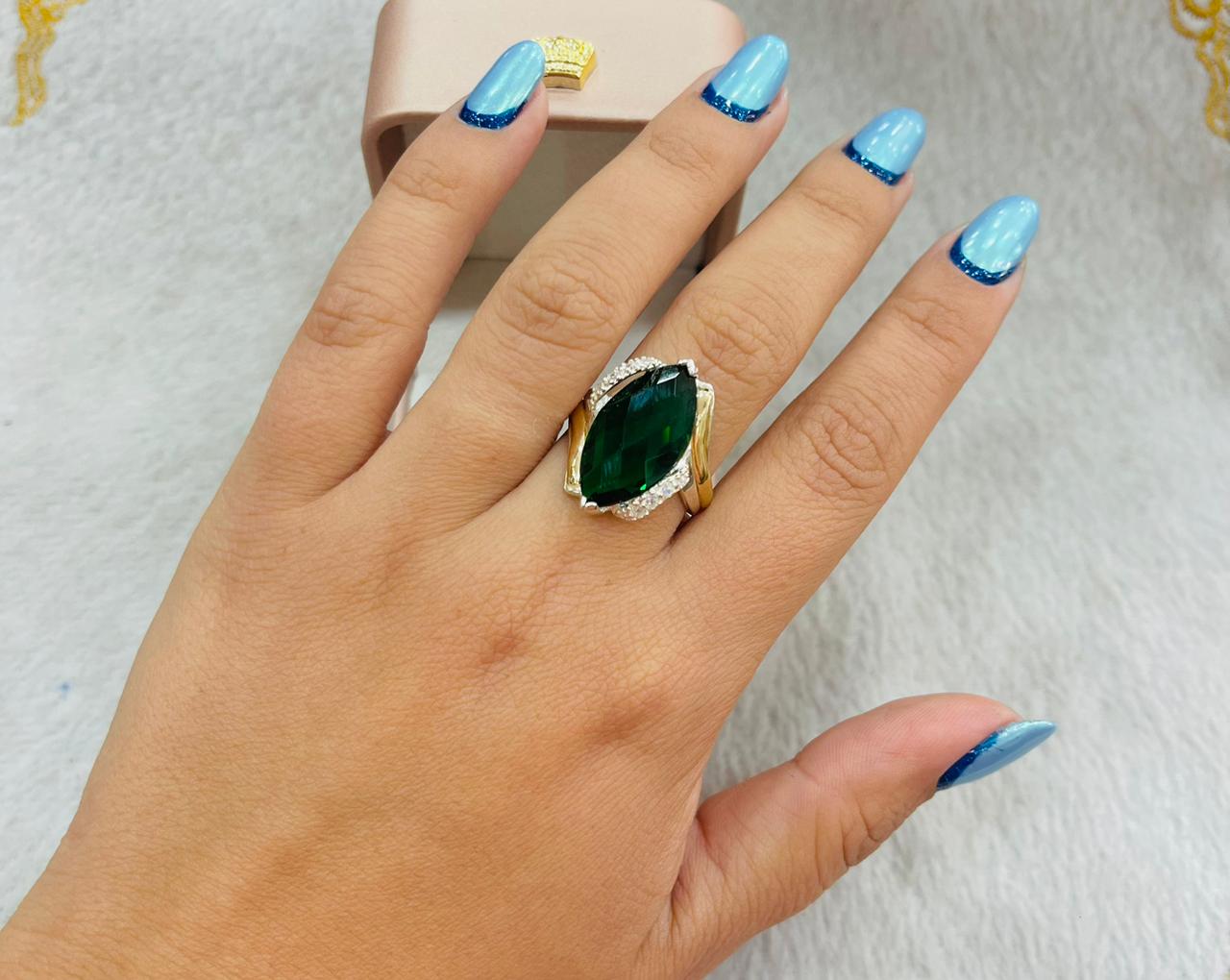 Este anillo de alta calidad está hecho de plata noble que destaca la belleza de la piedra circón verde de excelente claridad, presentado en un corte navette elegante y sofisticado. Los detalles en lámina dorada agregan un toque de lujo a esta pieza perfecta para un ocasional formal o noche de gala.
