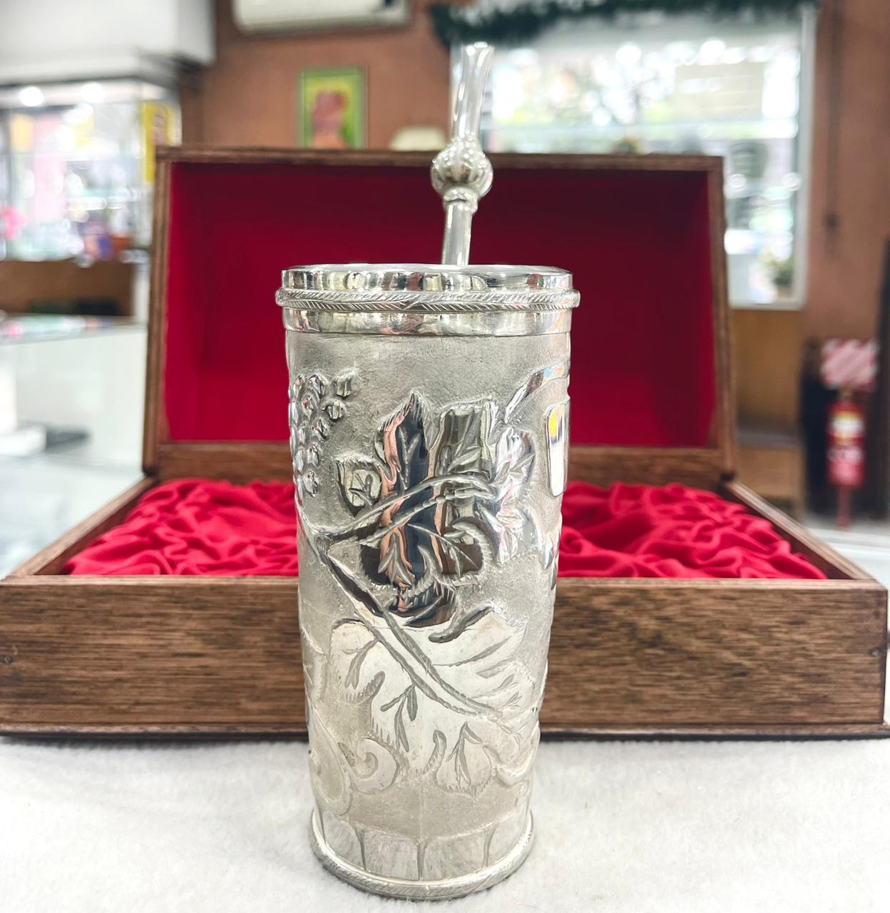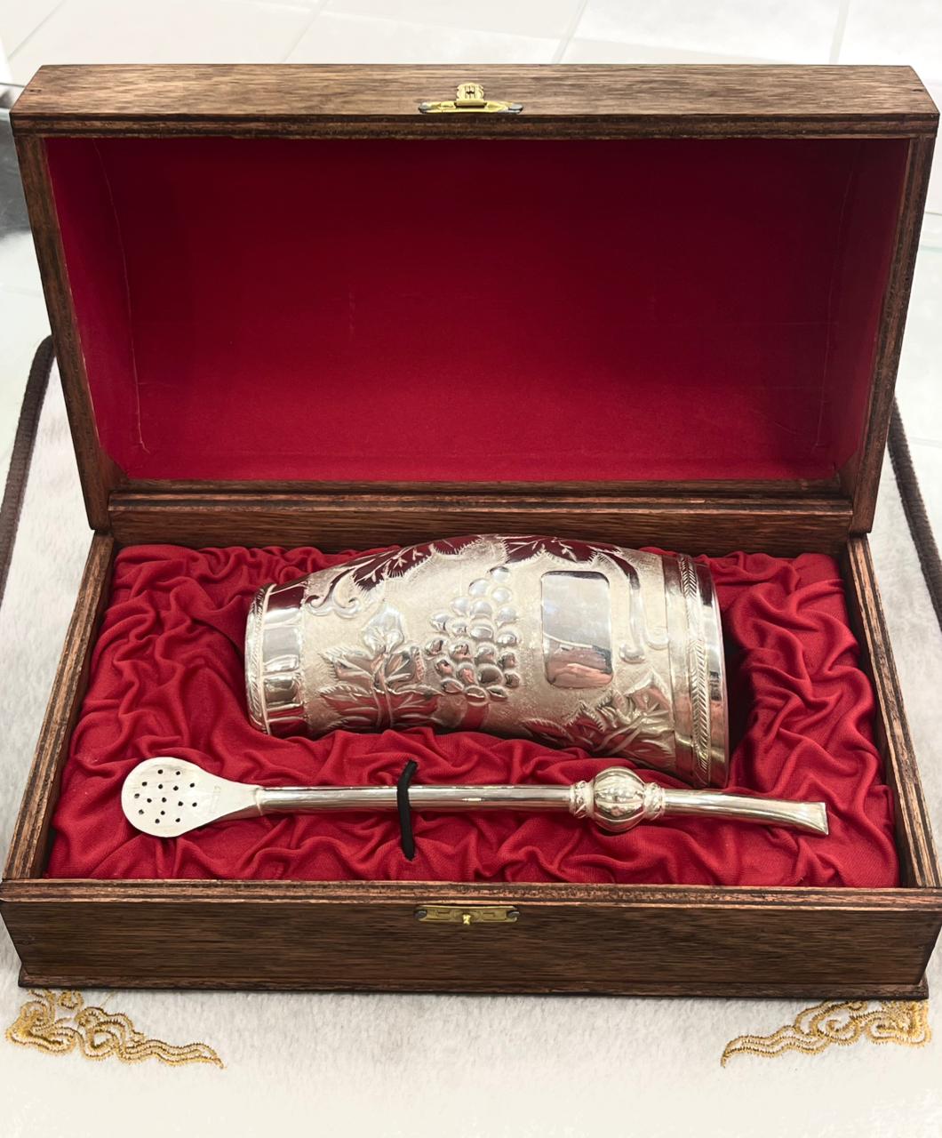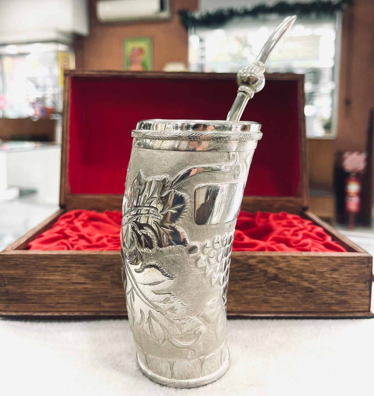 Guampa Forrada en Plata + Bombilla de Plata Diseño Paisaje Uva