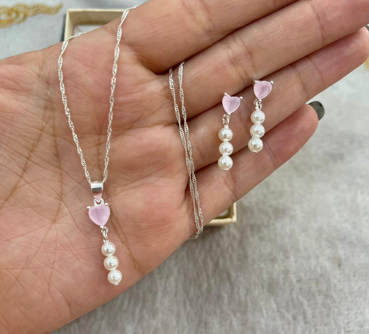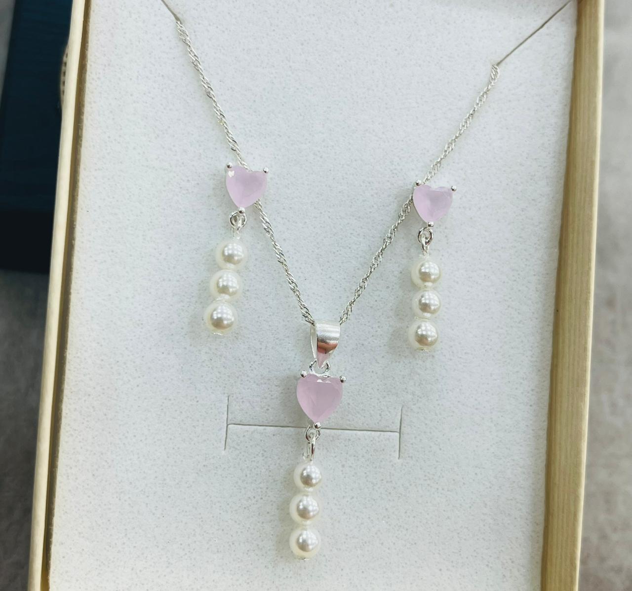 Juego de Plata Perlas y Corazón de Cuarzo Rosa