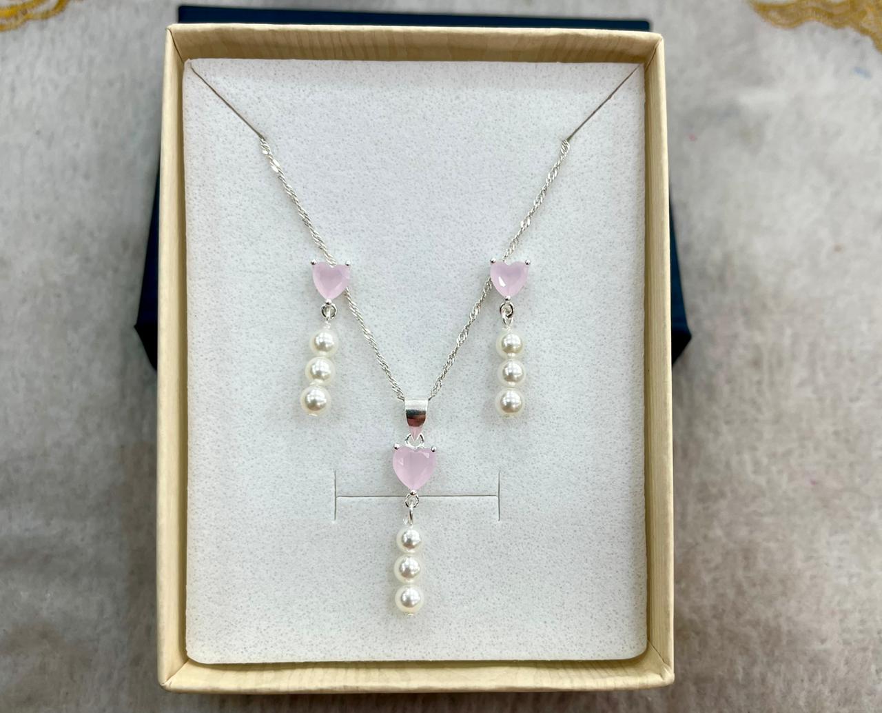 Este juego de joyería en plata presenta una delicada combinación de perlas y un corazón de cuarzo rosa, creando un diseño etéreo y elegante que destaca la belleza de la naturaleza.