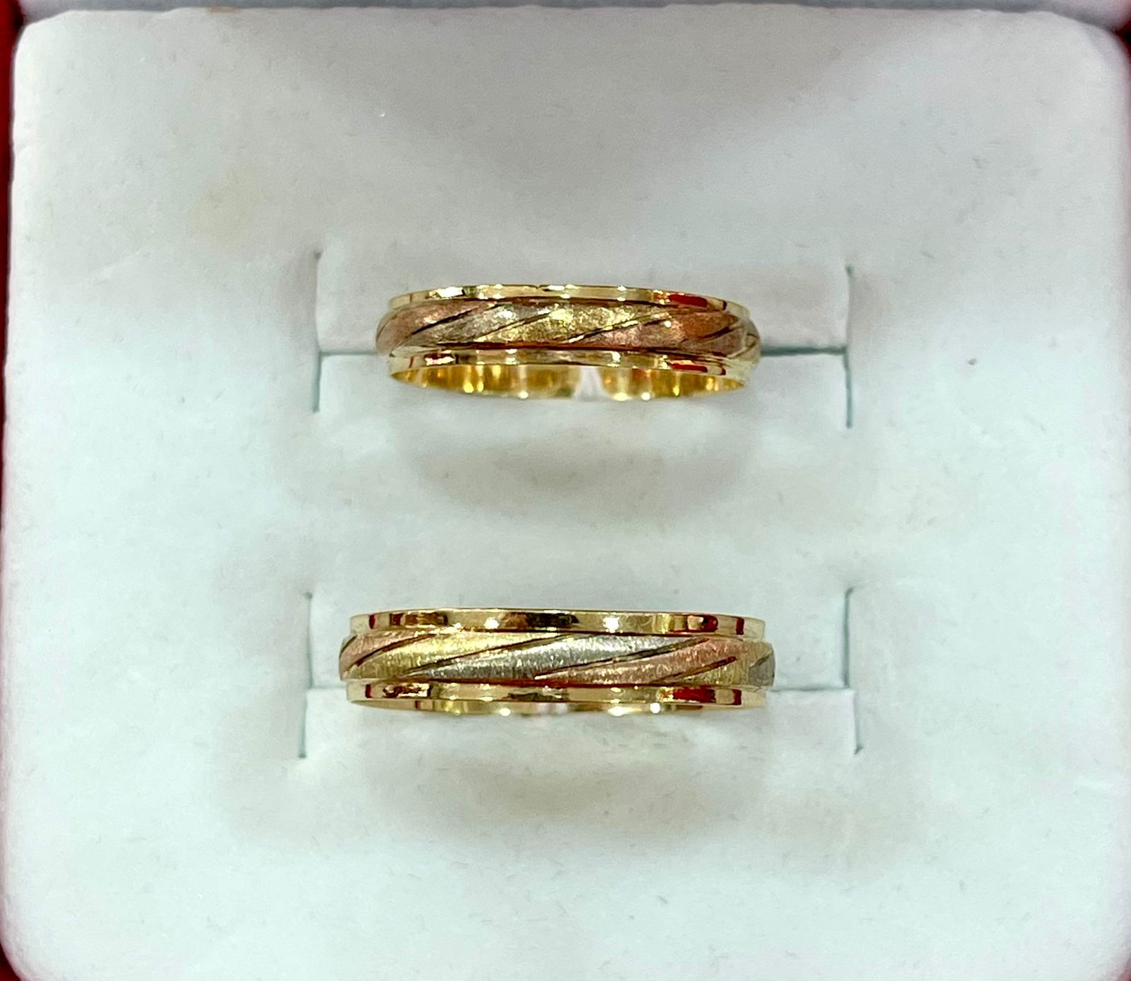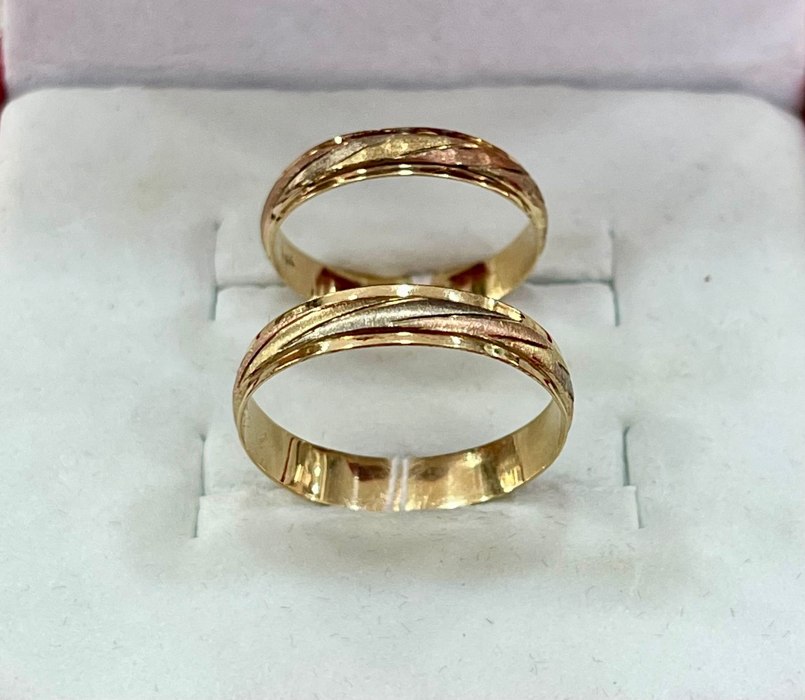 Este par de alianzas de oro 18k destaca por su belleza y sofisticación, con un diseño en tres tonos (Rojo, Amarillo, Blanco) que se combinan perfectamente para crear un efecto de lujo y elegancia. Cada pieza está hecha con atención al detalle y presenta una delicada textura que brilla al ser tocada. Ideal para el día de la boda o como regalo de compromiso.