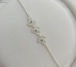 Esta pulsera de joyería es un ejemplo perfecto de la destreza de nuestra casa de joyeros. La filigrana en plata crea un patrón delicado y artístico alrededor de un hermoso trébol central con piedra de agua marina que destaca su verdor y esplendor. Ideal para una noche formal o un evento especial.