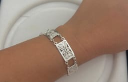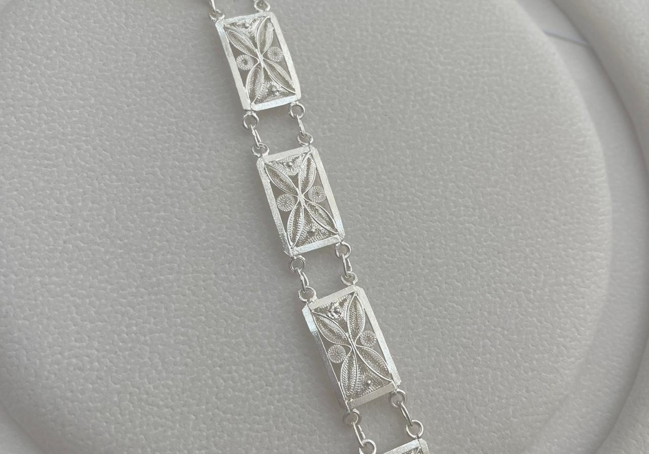 Esta pulsera de filigrana destaca por su elegancia y sofisticación, con eslabones rectangulares que se entrelazan en un patrón delicado. Hecha a mano con técnicas tradicionales, esta pieza es ideal para ocasiones formales y especiales, como bodas y eventos de gala.