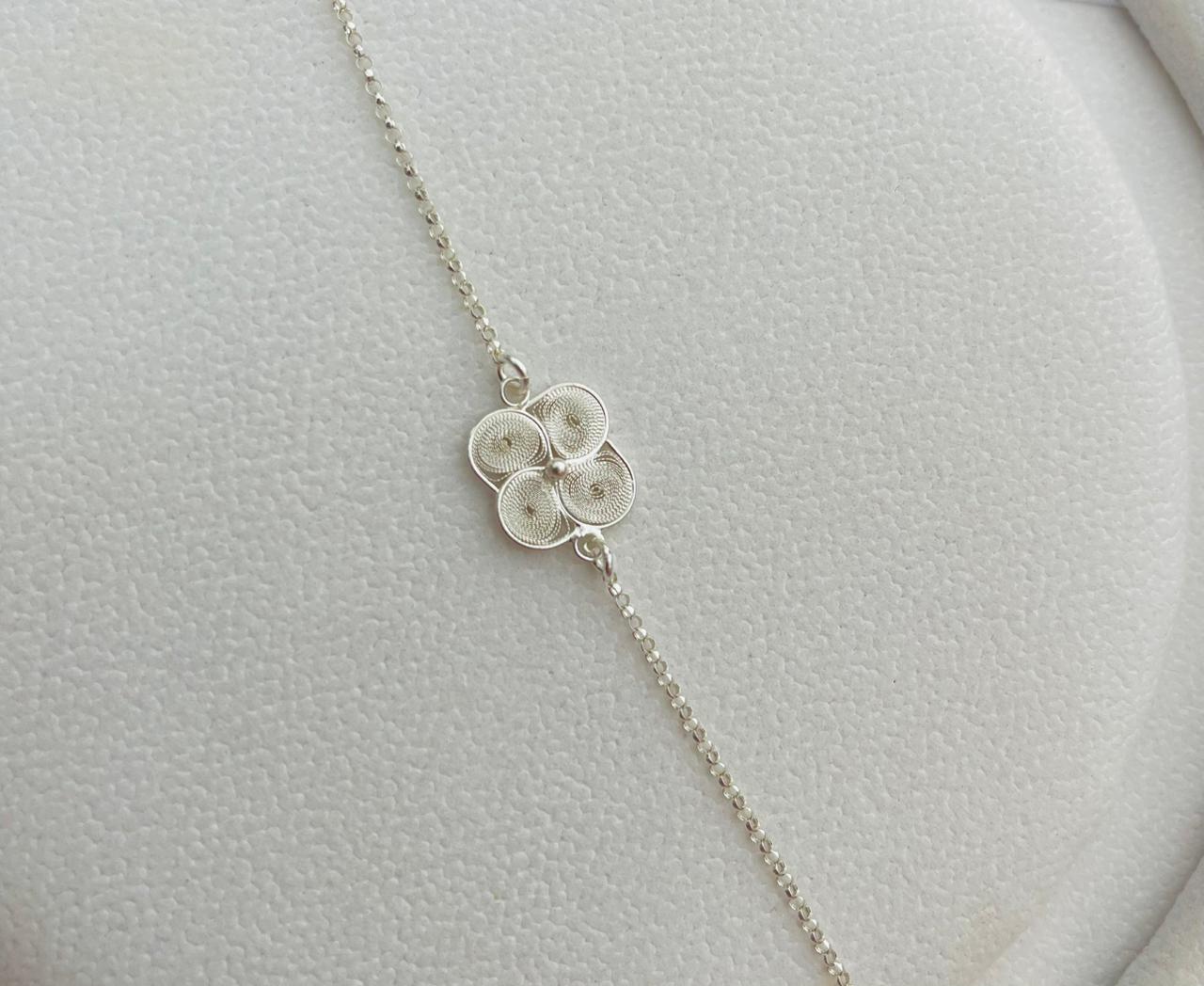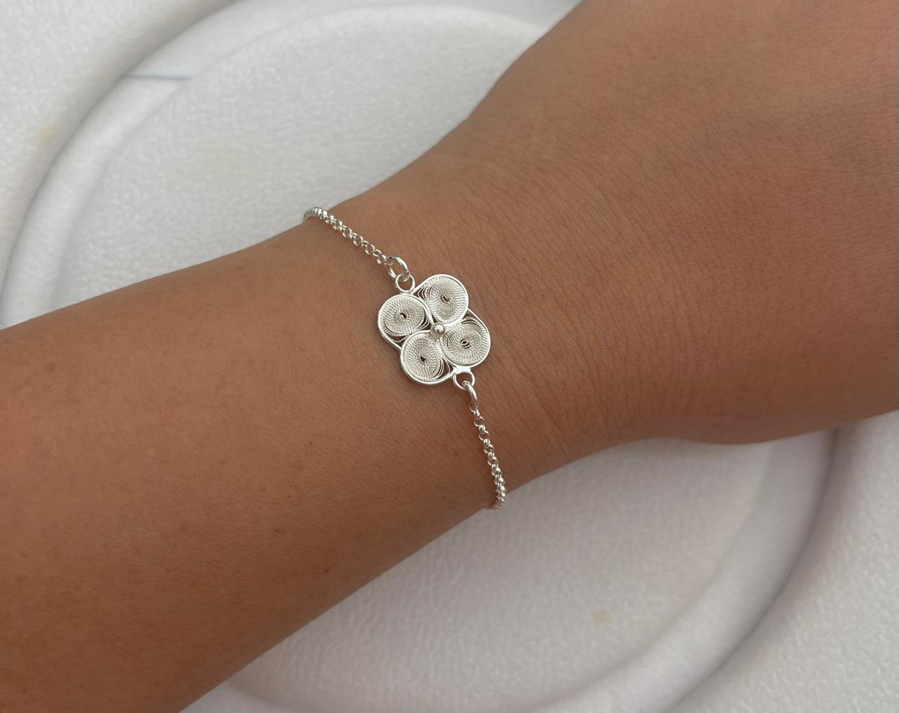 Esta pulsera de plata de alta calidad presenta un diseño elegante y sofisticado, con una hermosa flor remolino en el centro realizada a través de la técnica de filigrana.